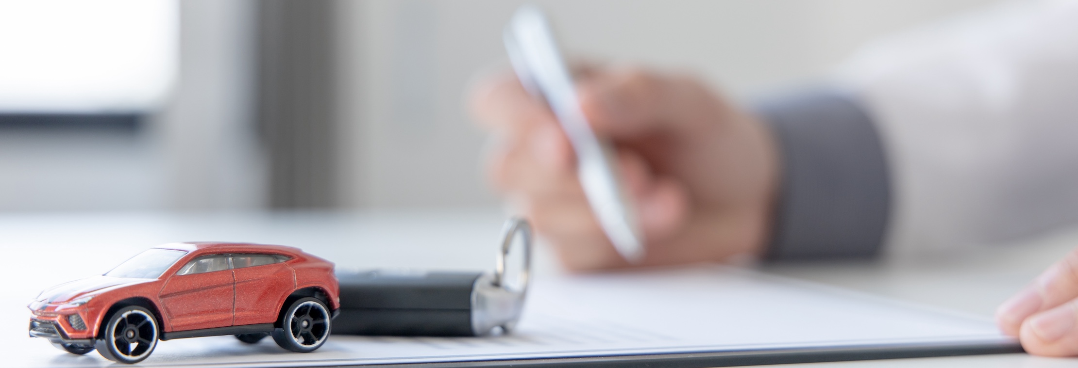 A person is holding a smartphone at a desk with orange and silver toy cars on documents representing a car accident in Knoxville, an insurance claim scenario.