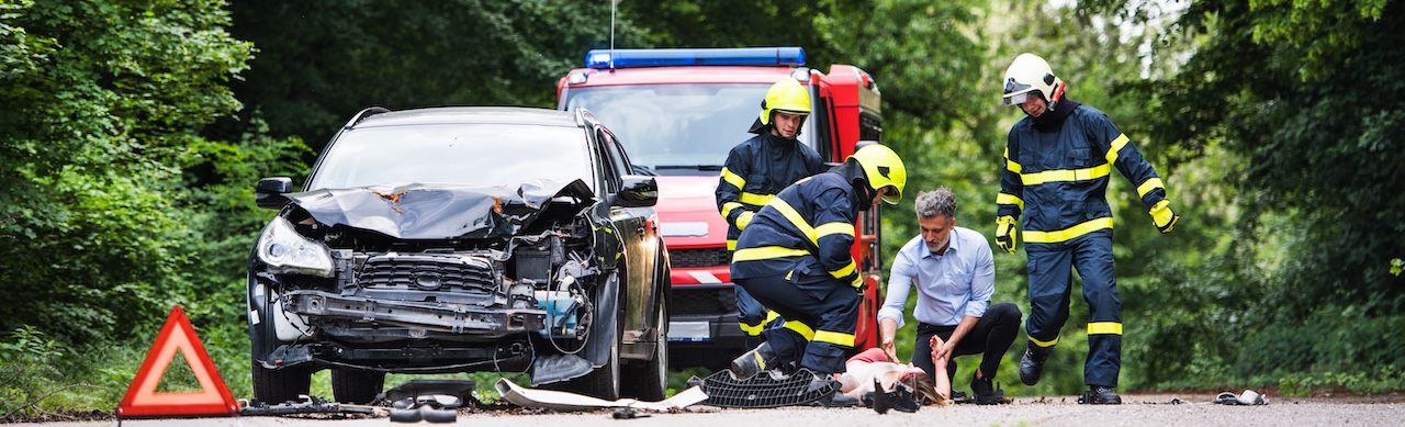 Emergency responders in reflective gear are attending to an injured person lying on the road beside a severely damaged black car wreck with a fire truck behind.