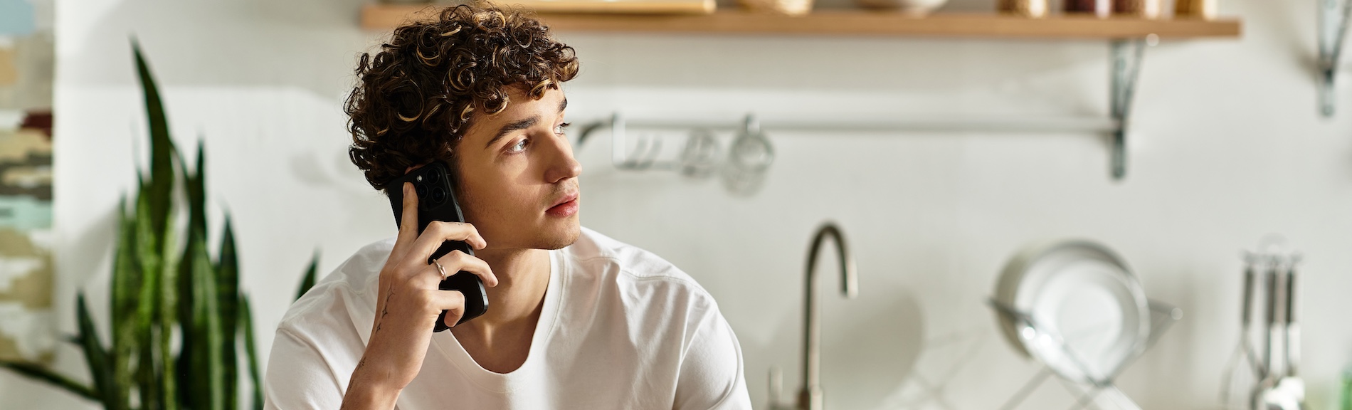 A young man with curly hair is talking on the phone in a modern kitchen while handling a car crash insurance call after a recent accident.
